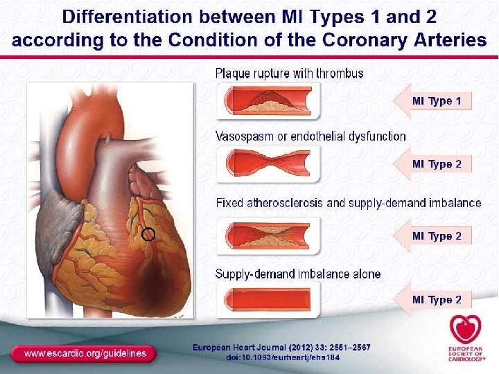 Classification of MI Type 1 – spontaneous MI related to ischemia due to a primary coronary event such as plaque erosion and/or rupture, fissuring, or dissection Type 2 – MI secondary to ischemia due to either increased oxygen demand or decreased supply, e. g. coronary artery spasm Coronary embolism, Anemia, arrhythmias , Hypertension, or hypotension