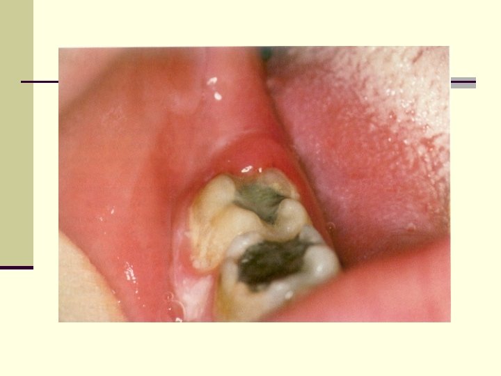 Clinical Features Signs and Symptoms: n Markedly red, edematous suppurating lesion , extremely tender with radiating pain to the ear, throat and floor of the mouth. n Foul taste n Inability to close the jaws. n Swelling of the cheek in the region of the angle of the jaw is seen.