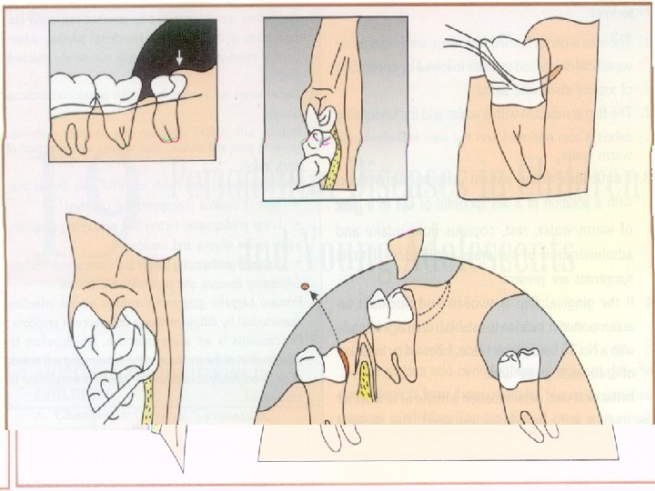 Acute Pericoronitis n Varying degrees of involvement of pericoronal flap as well as with systemic complications. n An influx of inflammatory fluid and cellular exudates results in an increase in bulk of the flap which interferes with complete closure of the jaws. The flap is traumatized by contact with the opposing jaw and inflammatory involvement is aggravated. n Lymphadenitis, toxic systemic complications- fever, leukocytosis and malaise.