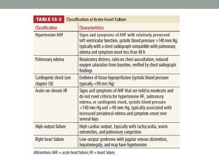 General feature ® • Diaphoresis ( intense sympathetic activation) • Dyspnea (Pulmonary edema) • JVD (50%), • Edema (33%), • S 3 gallop (25%) : the impact of inflowing blood against a distended or incompliant ventricle • Hypertensive > Normo/Hypotensive • Cardiogenic shock