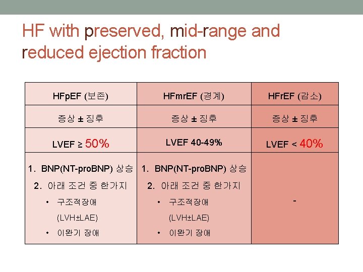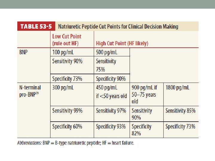 Natriuretic Peptide Assay • BNP + NT pro. BNP • When diagnostic uncertainty exists, rather than as a routine • Correlating with cardiac filling pressures and ventricular stretch • Affected by age, gender, and obesity • may elevate later in the rapid onset pulmonary edema. • Dyspnea + modest B-type natriuretic peptide elevation • pulmonary hypertension, pulmonary embolism • pneumonia, sepsis, and renal failure. • Prognosis • Marked elevation : short term (ED) • Low elevation : long term