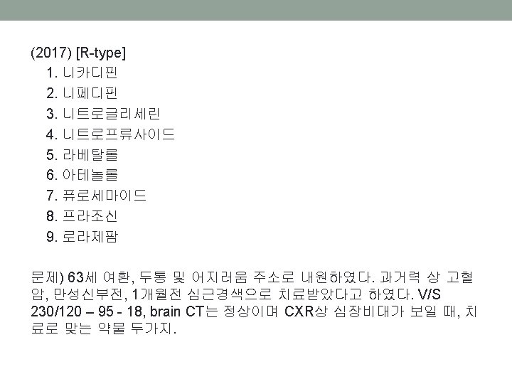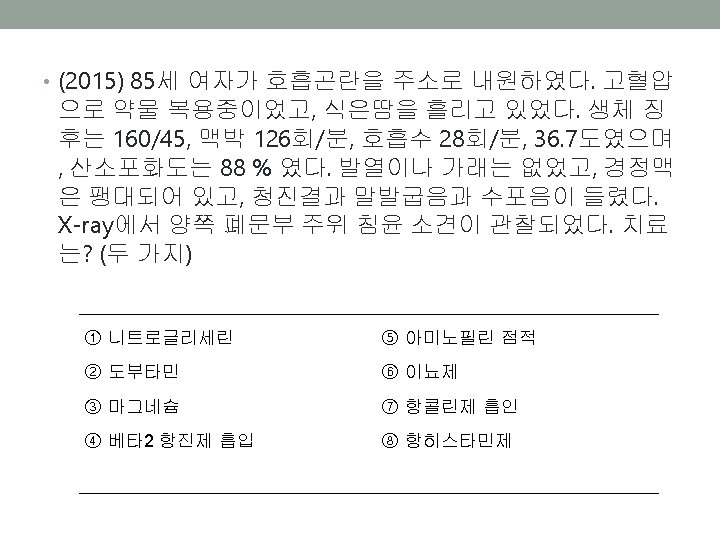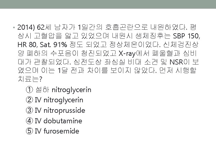 • (2013) 60세 남자 BP 180/100, HR 100회, Sa. O 2 90% 촉진상 심장박동이 가장 잘 느껴지는 부위가 왼쪽으로 전위, 청진 상 양측폐야의 쌕쌕거림, EKG상 LVH, X-ray상 양측폐 간질 음영이 보인다. 치료제는? ① Dobu+Furosemide ② NTG+Furosemide ③ NTG+Digoxin ④ Salbutamol+Dobutamine ⑤ Salbutamol+Methylprednisolone