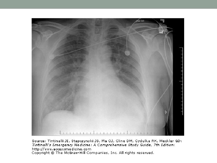 Chest Radiography • Low sensitivity (<20%) • Time lag by up to 6 hours of the clinical appearance • unreliable in chronic heart failure • Dilated upper lobe vessels • Cardiomegaly • Interstitial edema, alveolar edema, Kerley lines • Enlarged pulmonary artery • Pleural effusion • Prominent superior vena cava