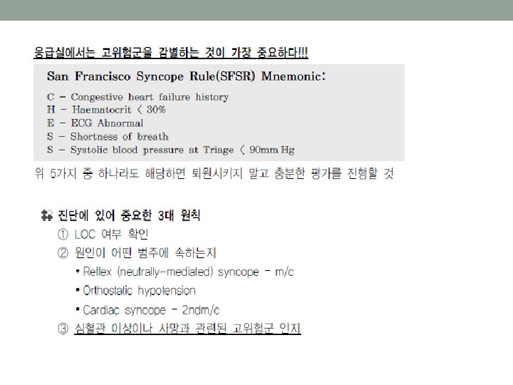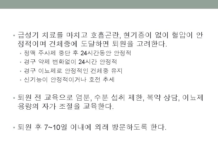 • 침습적 모니터링이나 시술이 필요한 고위험군 환자들은 중 환자실로 입원한다. • 표준 치료를 제공한 후 대부분 12~24시간 후에는 증상이 소실되고 안정화된다. • 그러나 다음 조건의 환자들에서는 재검진과 추가 치료를 요한다. • Positive troponin • Blood urea nitrogen >40 milligrams/d. L • Creatinine >3. 0 milligrams/d. L • Sodium <135 m. Eq/L • New ischemic changes on ECG • New onset of acute heart failure • IV vasoactive infusions being actively titrated • Significant comorbidities requiring acute interventions • Respiratory rate ≥ 32 breaths/min and/or requiring noninvasive ventilation at the time of Observation Unit consideration • Signs of poor perfusion at the time of Observation Unit consideration