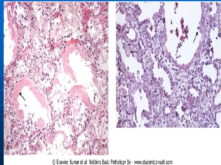 The most characteristic finding is the presence of hyaline membranes, particularly lining the distended alveolar ducts. - Such membranes consist of fibrinrich edema fluid admixed with remnants of necrotic epithelial cells. a.