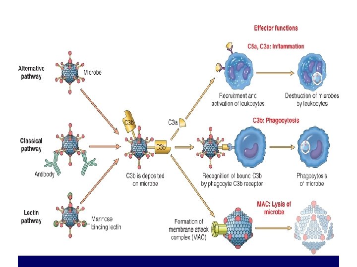 Functions of complement • Vascular effects – C 3 a and C 5 a ( anaphylatoxins) –increase vascular permeability and vasodilation by inducing mast cells to release histamine. • C 5 a – Potent chemotactic agent for N, M, E, B – Activate leukocytes – Increase their adhesion to the vascular endothelium – Activate Arachidonic acid pathway • Phagocytosis – C 3 b and C 3 bi act as opsonins