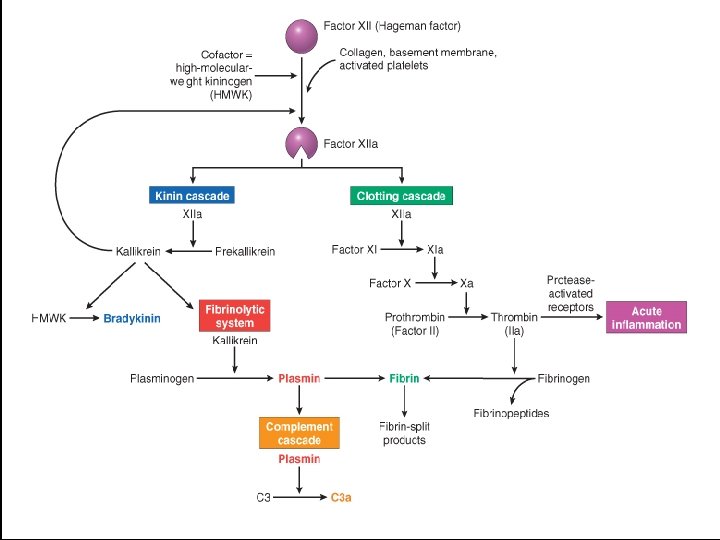 Clotting –fibrinolytic system • Interrelationships between the four plasma mediator systems triggered by activation of factor XII (Hageman factor). • Note that thrombin induces inflammation by binding to protease-activated receptors (principally PAR-1) on – – platelets, endothelium, smooth muscle cells, other cells.