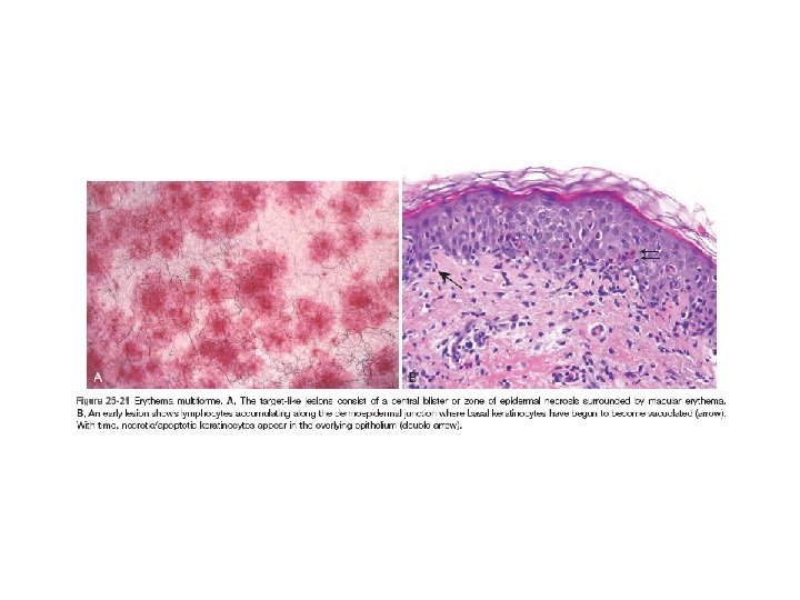 • MORPHOLOGY: Affected individuals present with a diverse array of lesions (hence the term multiforme), including macules, papules, vesicles, bullae, and characteristic targetoid (target-like) lesions. A febrile form associated with extensive involvement of the skin is called Stevens-Johnson syndrome, which is often (but not exclusively) seen in children. lesions involve not only the skin but also the lips and oral mucosa, conjunctiva, urethra, and genital and perianal areas. Secondary infection of involved areas due to loss of skin integrity may result in lifethreatening sepsis.