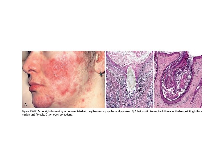 Acne Vulgaris • Disorder of Epidermal Appendages. • Virtually universal in the middle to late teenage years, acne vulgaris affects both males and females, although males tend to have more severe disease. • Acne is seen in all races but is usually milder in people of Asian descent. • It may be induced or exacerbated by drugs (corticosteroids, adrenocorticotropic hormone, testosterone, gonadotropins, contraceptives, trimethadione, iodides, and bromides), occupational exposures (cutting oils, chlorinated hydrocarbons, and coal tars), and conditions that favor occlusion of sebaceous glands, such as heavy clothing, cosmetics, and tropical climates. Some families seem to be particularly prone to acne, suggesting a hereditary component.