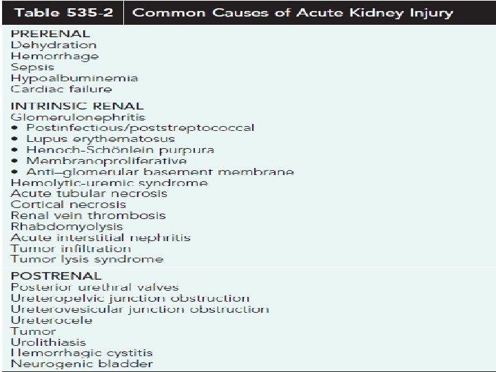 Intrinsic renal AKI • Intrinsic renal AKI includes a variety of disorders characterized by renal parenchymal damage, including sustained hypoperfusion and ischemia. • Many forms of glomerulonephritis, including postinfectious glomerulonephritis, lupus nephritis, Henoch. Scnlein purpura nephritis, membranoproliferative glomerulonephritis, and anti– glomerular basement membrane nephritis, can cause AKI. • Ischemic/ hypoxic injury and nephrotoxic insults are the most common causes of intrinsic AKI in the United States, and are more common with an underlying comorbid condition; most are associated with cardiac, oncologic, urologic, renal, and genetic disorders or prematurity.