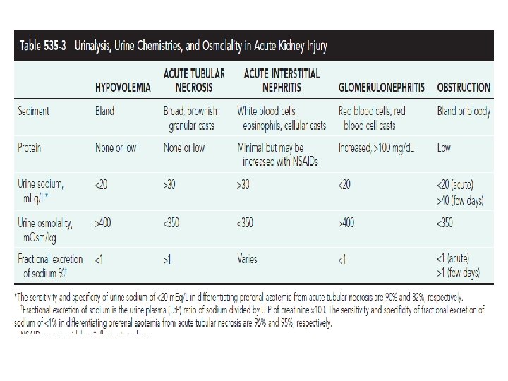 • Urinary indices may be useful in differentiating prerenal AKI from intrinsic AKI. • Patients whose urine shows an elevated specific gravity (>1. 020), elevated urine osmolality (UOsm > 500 m. Osm/kg), low urine sodium (UNa < 20 m. Eq/L), and fractional excretion of sodium <1% (<2. 5% in neonates) most likely have prerenal AKI. • Those with a specific gravity of <1. 010, low urine osmolality (UOsm < 350 m. Osm/kg), high urine sodium (UNa > 40 m. Eq/L), and fractional excretion of sodium >2% (>10% in neonates) most likely have intrinsic AKI.