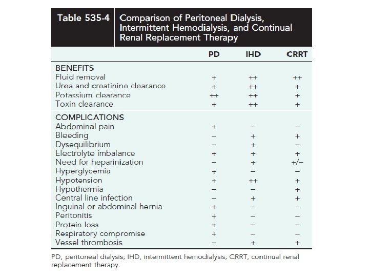 • Indications for dialysis in AKI include the following: • • Anuria/oliguria • • Volume overload with evidence of hypertension and/or pulmonary edema refractory to diuretic therapy • • Persistent hyperkalemia • • Severe metabolic acidosis unresponsive to medical management • • Uremia (encephalopathy, pericarditis, neuropathy) • • Blood urea nitrogen >100 -150 mg/d. L (or lower if rapidly rising) • • Calcium: phosphorus imbalance, with hypocalcemic tetany that cannot be controlled by other measures