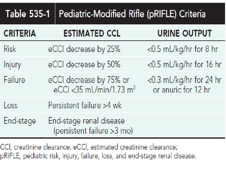 • A classification system has been proposed to standardize the definition of AKI in adults. • These criteria of risk, injury, failure, loss, and end-stage renal disease were given the acronym of RIFLE. • A modified RIFLE criteria (p. RIFLE) was developed to characterize the pattern of AKI in critically ill children.