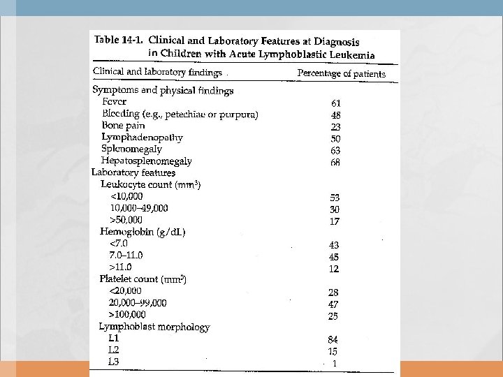 Clinical Manifestations usually nonspecific and relatively brief Anorexia, fatigue, and irritability intermittent, low-grade fever Bone or joint pain, particularly in the lower extremities physical examination • pallor, listlessness, purpuric and petechial skin lesions, or mucous • • membrane hemorrhage lymphadenopathy, splenomegaly Respiratory distress ; adolescent boys with T-cell ALL