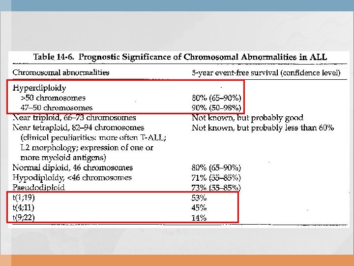 ALL Prognosis long-term survival, with the rate greater than 80% after 5 yr most important prognostic factor is the choice of appropriate risk-directed therapy • the type of ALL • the stage of disease • the age of the patient • the rate of response to initial therapy