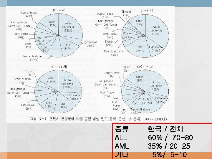 AML Epidemiology 11% of the cases of leukemia in childhood In Korea ; 일년에 100명 정도의 신환