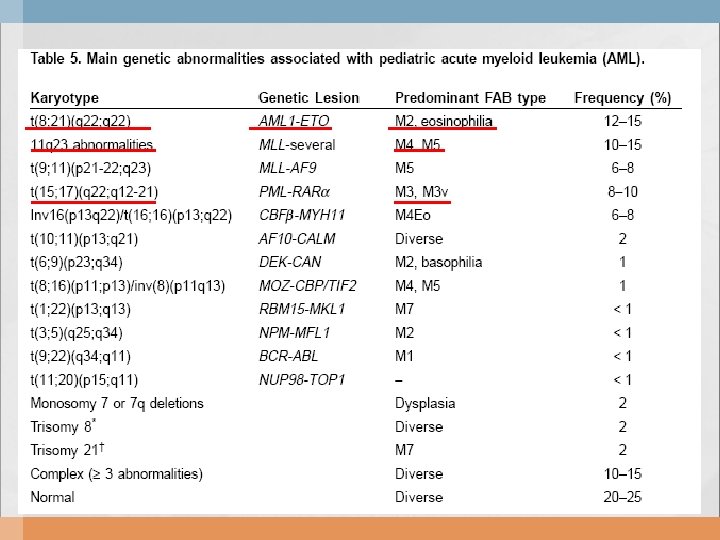 AML Acute promyelocytic leukemia most common genetic abnormality • reciprocal translocation between the PML gene at chromosome band 15 q 22 and RARα at 17 q 21 introduction of all-transretinoic acid (ATRA) as front-line therapy for APL Molecular testing for the PML-RARα fusion • Persistence or reappearance of the fusion transcript after completion of therapy -> relapse 25% of children ; relapse another 5% die of complications