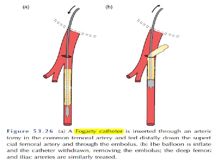 Surgical therapy • Embolectomy: common femoral ( lower limb ) • Brachial >> ( upper ) - under local or general anesthesia. - Fogarty catheter used. - intraoperative thrombolysis When residual thrombus exists. - intraoperative arteriogramis necessary to define the position of the clots so that the catheter can be placed as close to the clot as possible. and When the viability of the extremity is threatened or when there are poor Doppler signals in the distal extremity. - Bypass grafting. ***Heparin is reinstituted 6 to 12 hours after surgery because of a significant incidence of recurrent embolism. ***Amputation (usually after 12 hs the limb is paralysed due to irreversible damage).