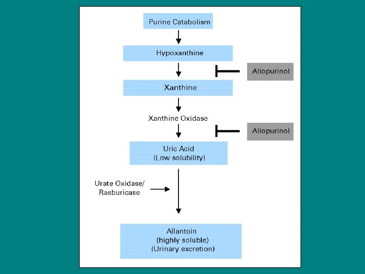 Tumor Lysis Syndrome • Prevention and management – IV hydration : promotes excretion of uric acid and phosphate; improves renal blood flow/GFR – Allopurinol → competitive inhibitor for xanthine oxidase. Therefore, ↓ conversion of purine metabolites to uric acid • However, must consider buildup of xanthine crystals → acute obstructive uropathy (HYDRATE!!!) – Recominant urate oxidase (rasburicase) • Promotes conversion of uric acid to allantoin (highly soluble; urinary excretion) • Indicated in patients at high risk of TLS (Burkitt’s Lymphoma, B-ALL, ALL (WBC >100, 000), AML (WBC >50, 000) • Also indicated in patients that develop hyperuricemia despite allopurinol – Dialysis can be used in severe cases – Urine alkalization is NOT recommended – does not increase solubility of xanthine/hypoxanthine with an increased propensity to develop xanthine -obstructive uropathies (esp with allopurinol use)