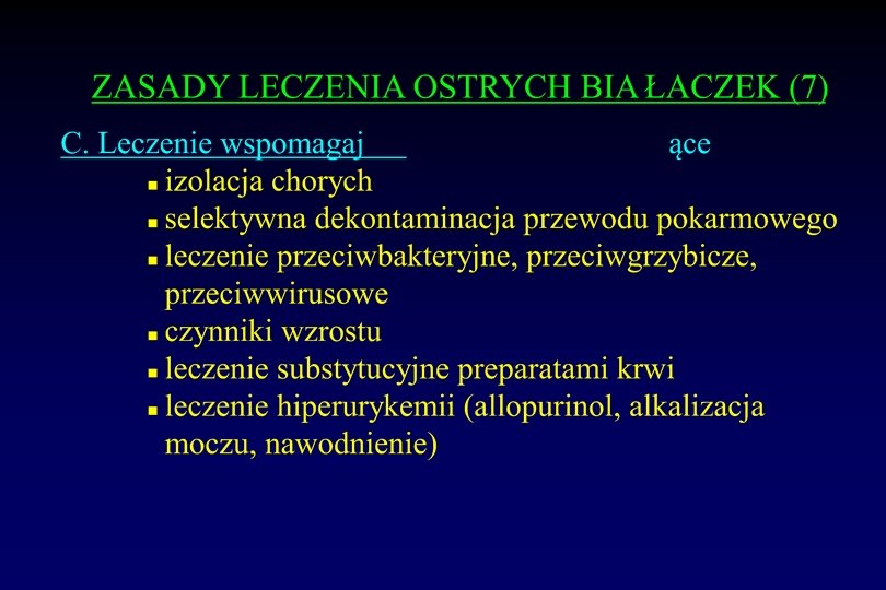 Acute myeloid leukemia Principle of the treatment • CNS prophylaxis/treatment - if clinical symptoms suggest meningeal leukemia AML-M 4 or 5 patients < 18 years old combination of drugs administered intrathecally (Ara-C plus Fenicort, MTX plus Fenicort) or CNS radiotherapy