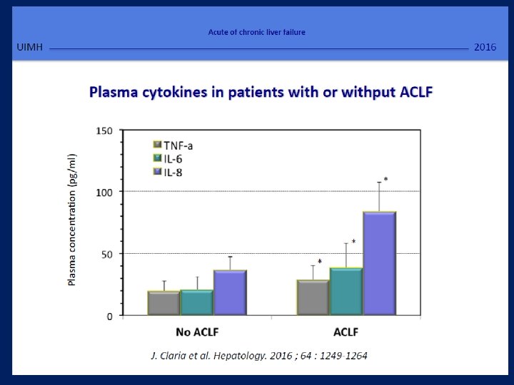 Systemic Inflammation is a Hallmark ACLF Potential precipitating events in patients with ACLF Extrahepatic precipitating events. Ø Acute bacterial infections: (PAMPs and virulence factors) Ø Translocation of bacterial products (endotoxins, lipoteichoic acid, peptidoglican, Bact-DNA with or without viable bacteria from the intestinal lumen to the systemic circulation: “Septic inflammation” (PAMPs) Intrahepatic precipitating events. Ø Acute liver injury: any causes of acute hepatic necrosis: (DAMPs) “Sterile inflammation”.