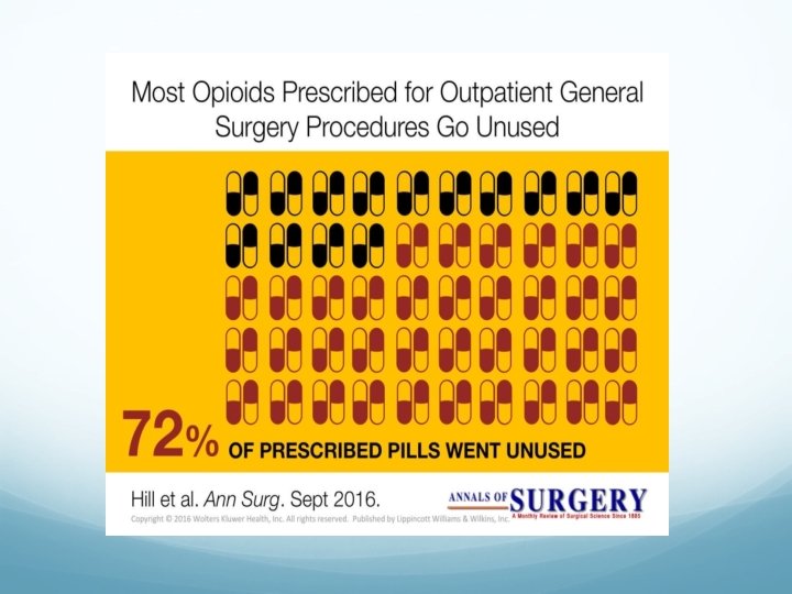 Excessive post-op opioid prescription • Opioid consumption following outpatient upper extremity surgery. Rodgers J, Cunningham K, Fitzgerald K, Finnerty E J Hand Surg Am. 2012 Apr; 37(4): 645 -50 67% of pills unused • Prescription Opioid Analgesics Commonly Unused After Surgery: A Systematic Review. Bicket MC, Long JJ, Pronovost PJ, Alexander GC, Wu CL JAMA Surg. 2017 Nov 1; 152(11): 1066 -1071 42% to 71% of prescribed opioids went unused In 2 studies examining storage safety, 73% to 77% of patients reported that their prescription opioids were not stored in locked containers