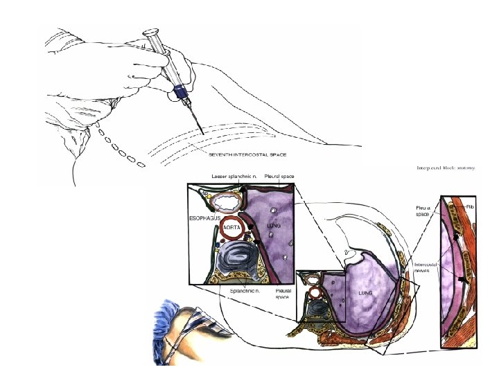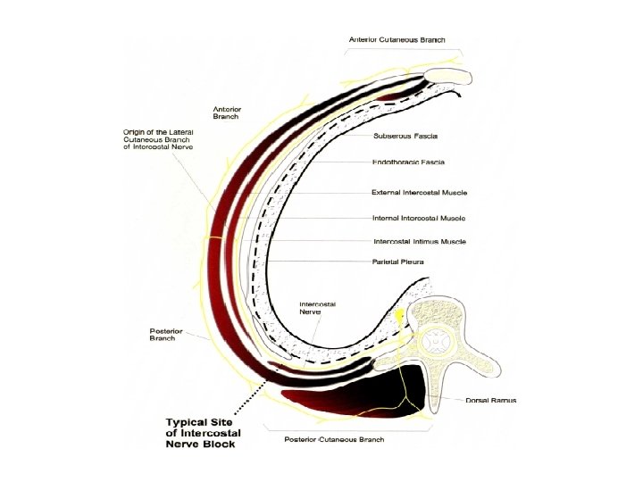 Interpleural block • Patient Selection: – Patients undergoing upper abdominal or flank surgery or those recovering from fractured ribs have been the patients most frequently selected for interpleural anesthesia. – Also has used for chronic pain(metastasis, etc) • Pharmacologic Choice: – Most commonly, 20 to 30 m. L of local anesthetic solution is injected via an interpleural needle or catheter. – The most common local anesthetic concentrations used have been 0. 25% to 0. 5% bupivacaine and 0. 2% to 0. 5% ropivacaine.