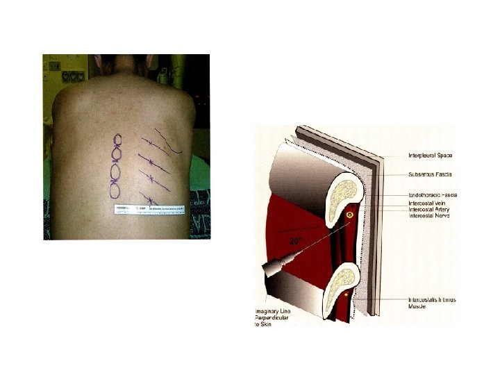 • Technique of Intercostal Block: – A line is drawn along the posterior vertebral spines. Nearly parallel lines are drawn along the posterior angles of the rib, which can be palpated 6 to 8 cm from the midline. These lines angle medially at the upper levels to prevent overlying of the scapula. – The inferior edge of each rib is palpated and marked on a line intersecting the posterior angle of the rib. After appropriate skin preparation, skin wheals are raised at each of these points. – A 22 -gauge, short-beveled 4 -cm needle is attached to a 10 -m. L syringe. Beginning at the lowest rib, the index finger of the left hand displaces the skin up over the patient's rib. The needle is inserted at the tip of the finger until it rests on the rib. The fingers of the left hand are shifted to grasp the needle hub firmly. The left hand then walks the needle 3 to 5 mm off the lower rib edge, where 3 to 5 m. L of local anesthetic is injected. – This process is repeated at each rib.