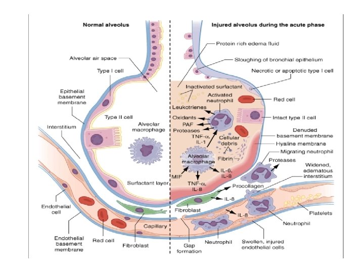 Patogenesis Terdapat 3 fase kerusakan alveolus : • Fase Eksudatif – Edema interstitial dan alveolar, denudasi membrana basalis, pembengkakan sel endotel, nekrosis sel pneumosit tipe I, pelebaran intercelluler junction, pembentukan membran hialin pada duktus alveolar dan inflamasi netrofil • Fase Proliferatif – Proliferasi sel pneumosit tipe II • Fase Fibrosis – Kolagen meningkat dan paru menjadi padat karena fibrosis