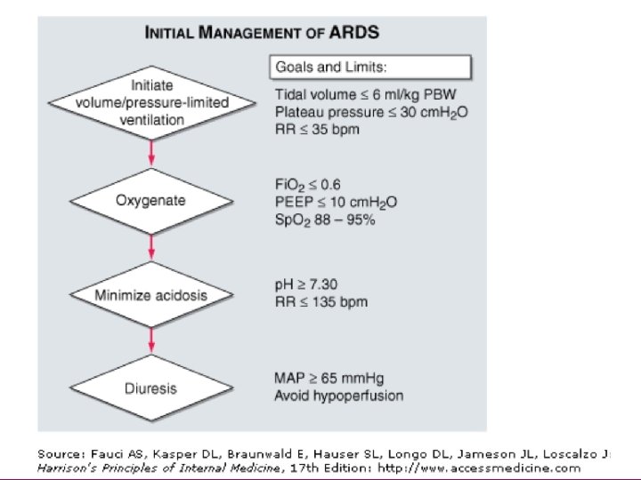 Mechanical Ventilator • Use the lowest PEEP & Fi. O 2 to maintain Pa. O 2 > 60 mm. Hg • Small tidal volume (6 ml/kg of ideal BW) & airway plateau pressure limits (< 30 cm. H 2 O ) • PEEP may increase as long as COP & O 2 delivery aren’t impaired and pulmonary pressures aren’t excessive