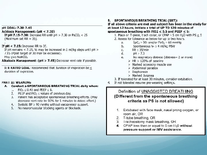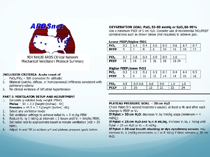 ARDS Net Protocol Given the decrease in mortality with low tidal volume ventilation, the ARDS Net protocol is the standard of care for patients with ARDS The initial tidal volume is set at 8 m. L/kg of predicted body weight and titrated down to 6 m. L/kg of predicted body weight It is important to know the height of the patient or have it measured, as the predicted body weight (ideal body weight) is calculated from the height of the patient The ARDS Net protocol is given on the next two slides