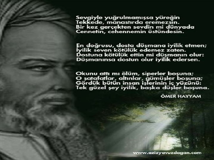üÖMER HAYYAM(1048 -1131) �Asıl adı Gıyaseddin Ebu’l Feth Bin İbrahim El Hayyamdır. 18 Mayıs İran’ın Nişabur kentinde doğdu. �İlgilendiği ilimler matematik, fizik, astronomi, şiir, müzik ve tıptır. Daha yaşadığı dönemde İbn-i Sina’dan sonra doğunun yetiştirdiği en büyük bilgin olarak kabul ediliyordu. �Yaptığı çalışmaların çoğunu kaleme almadı o ismini çokça duyduğumuz teoremlerin isimsiz kahramanıdır.