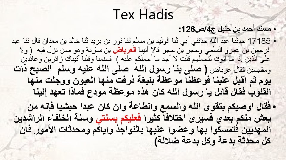• telah menceritakan kepada kami [Abdurrahman bin 'Amr As-Sulami] dan [Hujr bin Hujr] berkata; kami mendatangi [Al 'Irbadl bin Sariyah] dia adalah termasuk orang yang menyebabkan turunnya ayat, 'Dan tiada (pula) berdosa atas orang-orang yang apabila mereka datang kepadamu, supaya kamu memberi mereka kendaraan, lalu kamu berkata: "Aku tidak memperoleh kendaraan untuk membawamu " Lalu kami mengucapkan salam dan kami katakan, "Kami mendatangi anda, dalam rangka mengunjungi, kembali dan mencari ilmu. • lalu 'Irbadl berkata; "Rasulullah Shallallahu'alaihiwasallam shalat subuh bersama kami pada suatu hari, lalu beliau menemui kami dan memberi nasehat yang sangat mengena, yang menyebabkan mata bercucuran dan hati menjadi tergetar. Lalu ada seseorang yang bertanya, "Wahai Rasulullah, sepertinya ini adalah nasehat perpisahan, maka apa yang anda wasiatkan kepada kami". Beliau bersabda: "Saya wasiatkan kalian untuk bertakwa kepada Allah, mendengar dan taat walau kepada budak dari Habasyah. Sungguh siapa yang hidup di antara kalian setelahku akan melihat perselisihan yang banyak. Berpeganglah dengan sunahku dan sunnah Khulafa' Rasyidin yang mendapat petunjuk. Berpegang teguhlah dan gigitlah dengan gigi geraham. Hindarilah kalian h. Al hal yang baru, sesungguhnya setiap hal yang baru adalah bid'ah dan setiap bid'ah ada sesat.