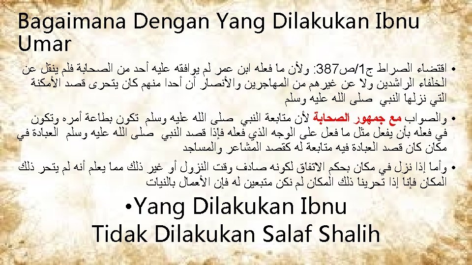 Pendapat Ibnu Taimiyah: ) ﻭﻛﺎﻧﺖ ﺳﻨﺔ ﺭﺳﻮﻝ ﺍﻟﻠﻪ ﺃﻨﻪ ﻳﻄﻌﻢ ﻣﺎ ﻳﺠﺪﻩ ﻓﻲ ﺃﺮﺿﻪ ﻭﻳﻠﺒﺲ ﻣﺎ : 316 ﺹ /21 • ﻣﺠﻤﻮﻉ ﺍﻟﻔﺘﺎﻭﻯ ﺝ ﻳﺠﺪﻩ ﻭﻳﺮﻛﺐ ﻣﺎ ﻳﺠﺪﻩ ﻣﻤﺎ ﺃﺒﺎﺣﻪ ﺍﻟﻠﻪ ﺗﻌﺎﻟﻰ ﻓﻤﻦ ﺍﺳﺘﻌﻤﻞ ﻣﺎ ﻳﺠﺪﻩ ﻓﻲ ﺃﺮﺿﻪ ﻓﻬﻮ ﺍﻟﻤﺘﺒﻊ ﻟﻠﺴﻨﺔ ﻛﻤﺎ ﺃﻨﻪ ( ﺣﺞ ﺍﻟﺒﻴﺖ ﻣﻦ ﻣﺪﻳﻨﺘﻪ ﻓﻤﻦ ﺣﺞ ﺍﻟﺒﻴﺖ ﻣﻦ ﻣﺪﻳﻨﺔ ﻧﻔﺴﻪ ﻓﻬﻮ ﺍﻟﻤﺘﺒﻊ ﻟﻠﺴﻨﺔ ﻭﺇﻥ ﻟﻢ ﺗﻜﻦ ﻫﺬﻩ ﺍﻟﻤﺪﻳﻨﺔ ﺗﻠﻚ • Sunah Rasulullah saw memakan apa yang ada di daerahnya, memakai pakaian yang ada di daerahnya yang Allah swt bolehkan, • barang siapa memakai apa yang ada didaerahnya maka ia mengikutu sunah, sebagaimana Rasulullah saw berangkat haji dari kota tempat tinggalnya, • barang siapa berangkat haji dari kota tempat tinggalnya, maka ia mengikuti sunah walaupun tidak berangkat haji dari kota Madinah munawwaroh.