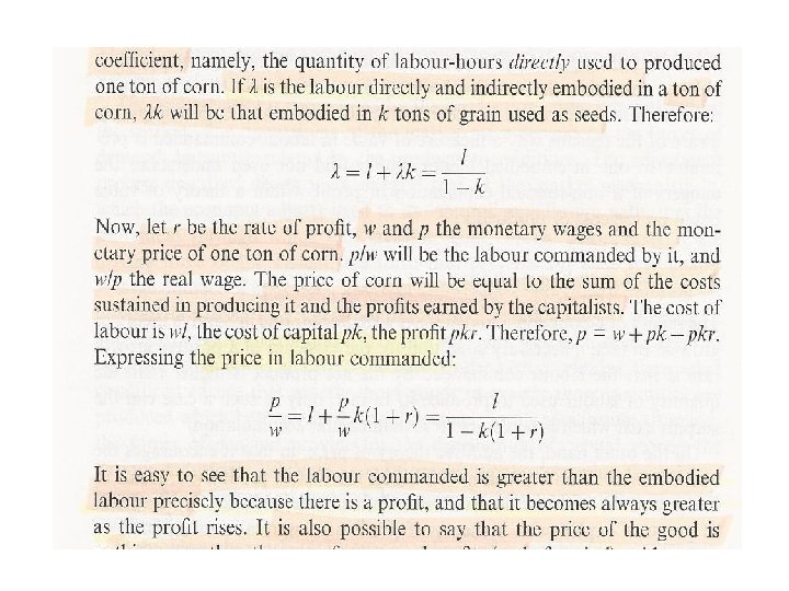 Modelo del valor de Smith (2). • Sea K el coeficiente de capital (cantidad de semillas para producir una tonelada de trigo). • Sea L el coeficiente de trabajo (horas de trabajo directas para producir una tonelada de trigo). • Sea el trabajo directa e indirectamente incorporado en 1 tonelada de trigo; – K será el trabajo contenido en las K toneladas utilizadas como semillas. • Por tanto, el trabajo incorporado en 1 tonelada de trigo será: – λ= L + λK; despejando, λ = L/1 -k (1)