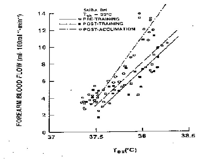 • FOREARM BLOOD FLOW. LOWER THRESHOLD FOR ONSET OF INCREASED FOREARM BLOOD FLOW. NO CHANGE IN FOREARM BLOOD FLOW RATE FOR A GIVEN CHANGE IN CORE TEMPERATURE (I. E. , NO CHANGE IN THE SENSITIVITY OR THE SLOPE OF THE LINE). INCREASED HEAT TRANSFER BY CONVECTION FROM CORE TO SKIN. NOTE: ADDITIONAL HEAT ACCLIMATION LOWERS THRESHOLD FOR ONSET OF FOREARM BLOOD FLOW (I. E. , SKIN BLOOD FLOW) AND INCREASES SENSITIVITY OF FLOW RATE (I. E. , GREATER SKIN BLOOD FLOW FOR A GIVEN INCREASE IN CORE TEMPERATURE).