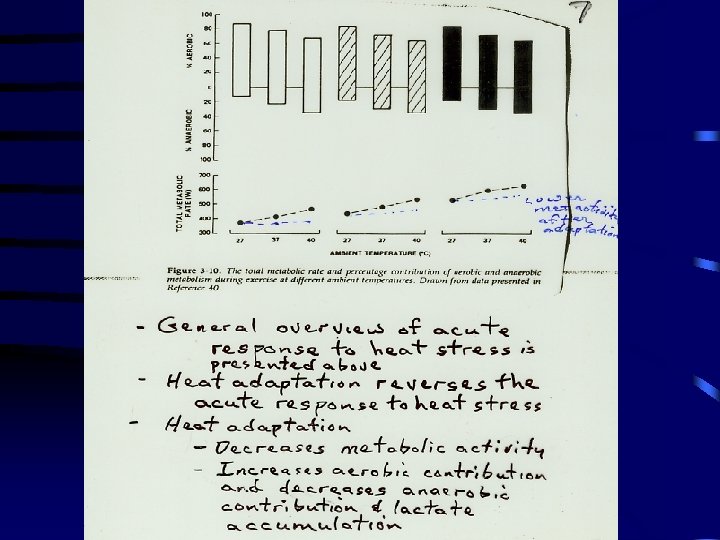 SUMMARY • INCREASED ANAEOBIC THRESHOLD WOULD ALSO: - INCREASE RELIANCE ON AEROBIC METABOLISM AND FAT UTILIZATION. - DECREASE RELIANCE ON ANAEROBIC METABOLISM AND CARBOHYDRAE UTLIZATION AS WELL AS DECREASE LACTIC ACID PRODUCTION. - INCREASE TENDENCY TOWARD HEMODILUTED BLOOD WHICH HAS BETTER HEAT TRANSFER CAPABILITIES.