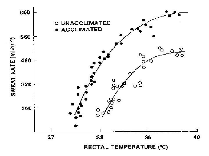 • GREATER SWEAT RATE FOR A GIVEN INCREASE IN CORE TEMPERATURE (TC) AND SKIN TEMPERATURE DUE TO INCREASED SENSITIVITY OF THE SWEAT GLANDS TO SYMPATHETIC NERVOUS SYSTEM STIMULATION, INCREASED SWEATING CAPACITY OF THE GLANDS, AND/OR DECREASED EFFECTS OF HIDROMEIOSIS (e. g. , habituation).