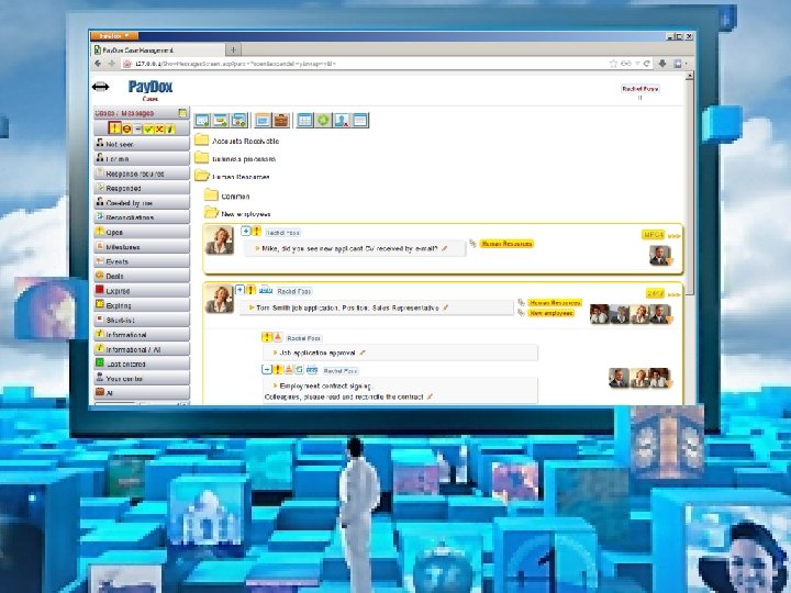 Pay. Dox Case Management ü LETS YOU: Create cases – sequences of tasks and messages containing: - to-do lists, tasks, assignments - user discussions - addressees and viewers - execution periods - documents, photos, videos - data tags and forms - business rules