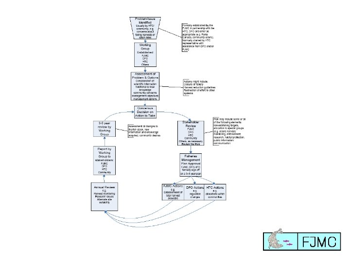 FJMC Operations and Adaptive Co. Management – FJMC Vision and Strategic Plan – Frequent meetings and conference calls to discuss issues, advice and recommendations – Community meetings with fishers and HTCs – DFO regional participation in meetings – Direct meetings with Minister of DFO – Science and TK workshops of scientists and fishers – Direct involvement of members in projects – Leadership, training and assessment of communitybased projects by DFO staff and FJMC members.