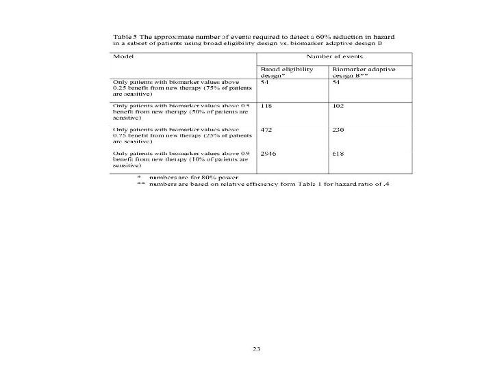 Estimated Power of Broad Eligibility Design (n=386 events) vs Adaptive Design (n=412 events) 80% power for 30% hazard reduction Model Broad Eligibility Design Biomarker Adaptive Design 40% reduction in 50% of patients (20% overall reduction) . 70 . 78 60% reduction in 25% of patients (20% overall reduction) . 65 . 91 79% reduction in 10% of patients (14% overall reduction) . 35 . 93