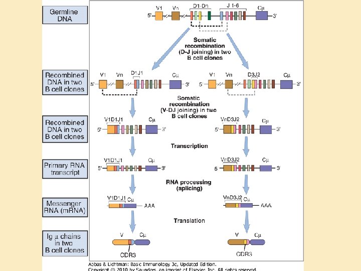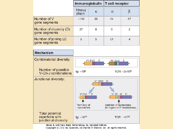 Factors that contribute to antigen receptor diversity • V, J, D gene variability: Large number of genes • V, J, D gene joining: – Selection – Order – Orientation • Junctional diversity: – Sloppy recombination – N region insertion • Heavy and light gene selection