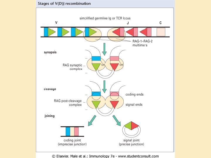 Recombination activating genes (RAG) • • RAG 1 and RAG 2 Enzyme complex Catalyze recombination and joining Essential for development of mature B and T cells