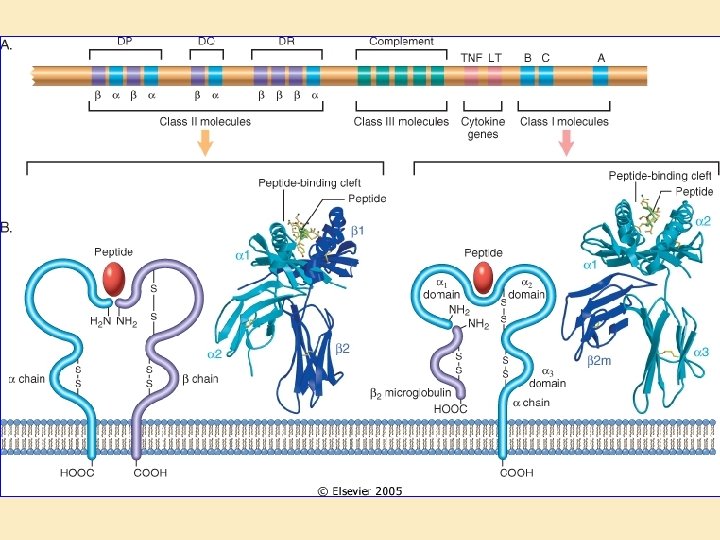 MHC structure: MHCII • a and b chains • Peptide-binding cleft • Peptide binding and constant domains