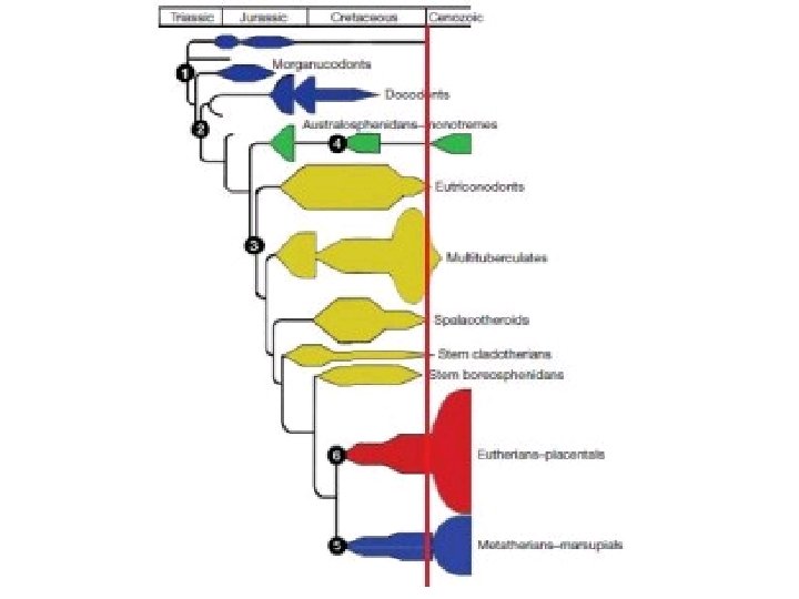 Placental and marsupial mammals radiated soon after dinosaur extinction, AND after many other mammal lineages also went extinct (see next slide)