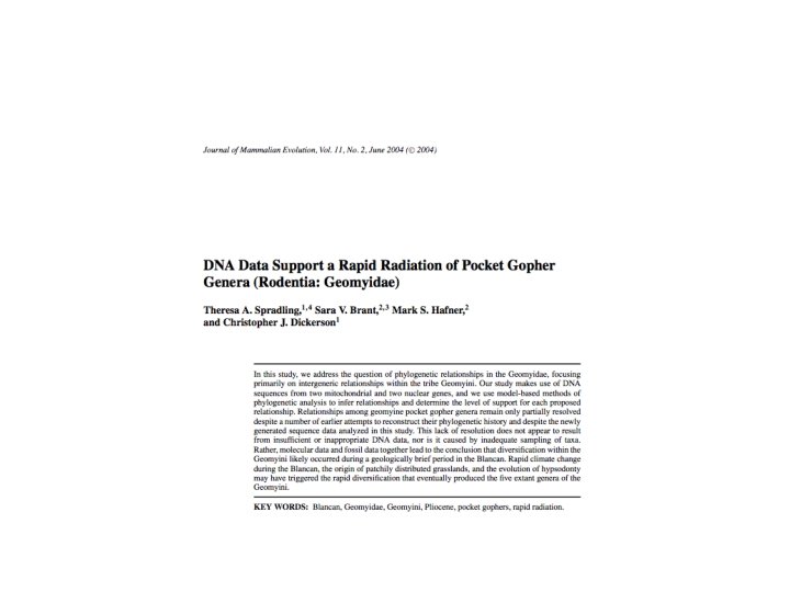 4 genera appeared over a 2 my period Pappogeomys, Cratogeomys, and Orthogeomys diverged over 800, 000 years Molecular data also support a relatively rapid radiation…