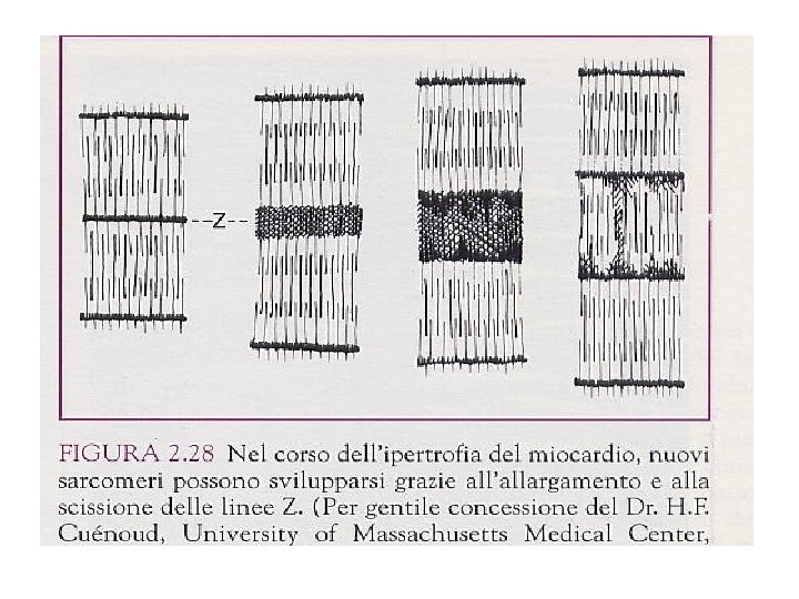 Alterazioni strutturali che insorgono durante l’ipertrofia progressiva portano “all’esaurimento” patologico del miocardio: Cause • Fibrosi (per aumento del connettivo) irrigidimento, ridotta compliance • Ipossia relativa capillari in • # minore rispetto alla massa • Alterazioni patologiche delle cellule: aggregati anomali di sarcotubuli, mitocondri alterati, figure mieliniche, aumento di glicogeno, perdita degli elementi contrattili e delle giunzioni specializzate, bizzarri ripiegamenti del nucleo