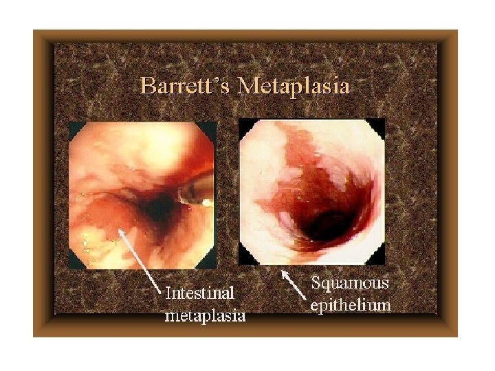 Metaplasia ghiandolare: Epitelio ghiandolare Epitelio squamoso - Uretere - Vescica - Esofago epitelio metaplastico di tipo gastrico o intestinale (ep. Di Barrett) causa: il succo gastrico che refluisce in esofago - Tratto digerente sede preferenziale di metaplasia