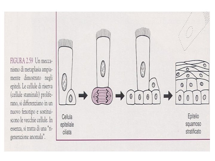Meccanismi della metaplasia • Una cellula di tipo A si trasforma in cellula di tipo B (rara nei mammiferi) • Il tipo A viene eliminato e sostituto dal tipo B (es. riprogrammazione delle cellule staminali) Quindi la metaplasia equivale ad una rigenerazione aberrante
