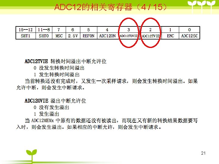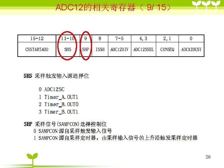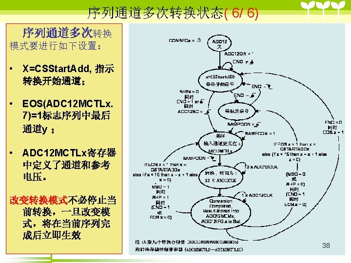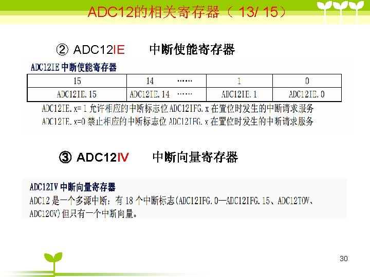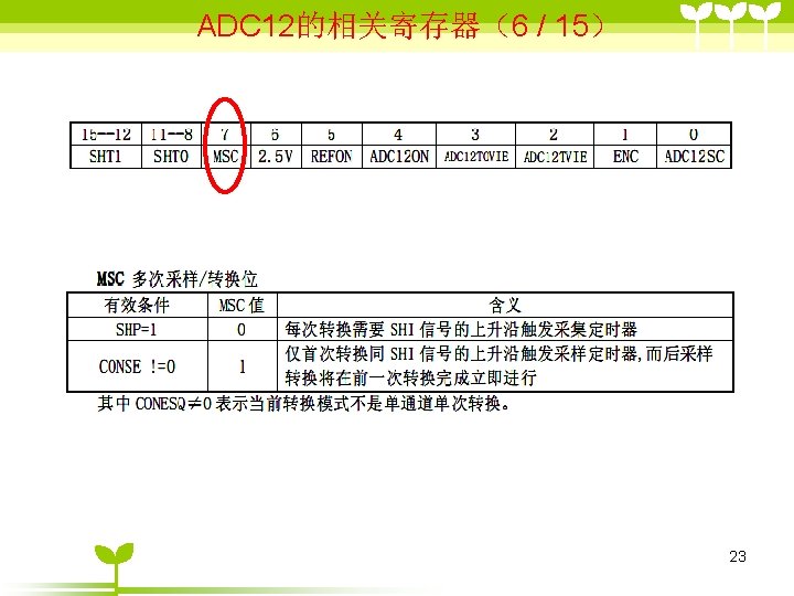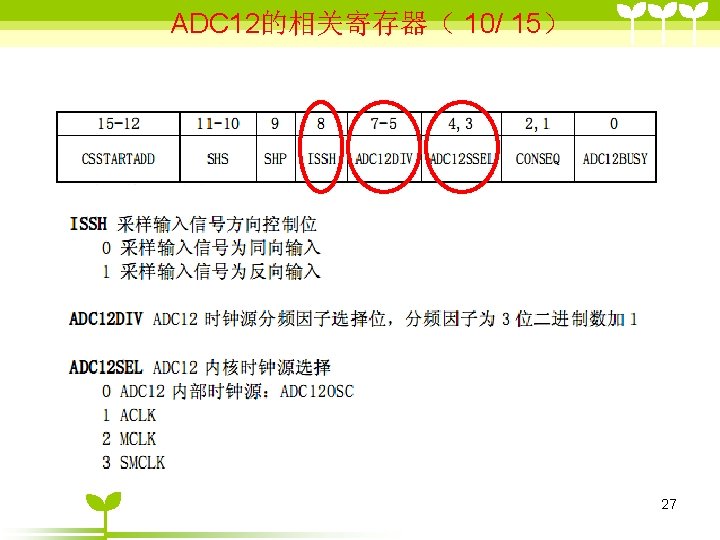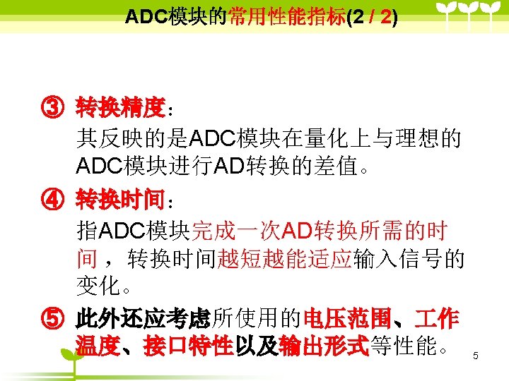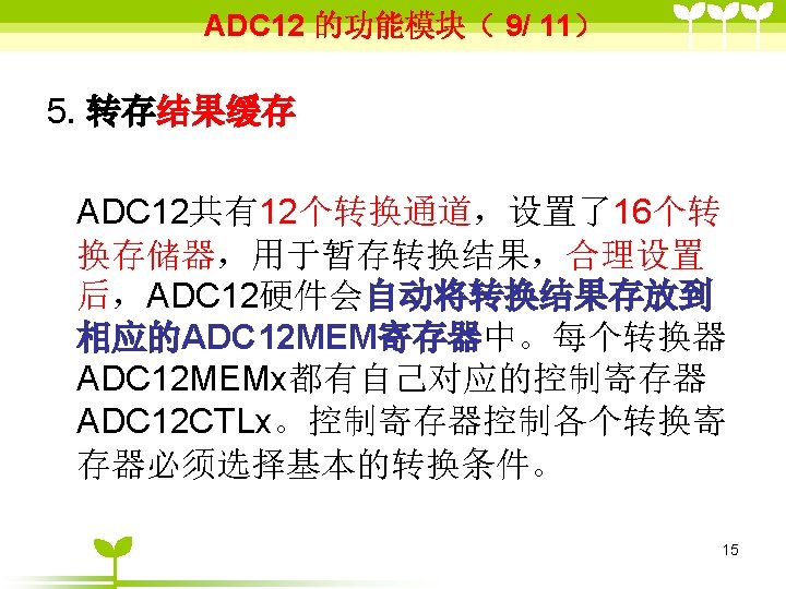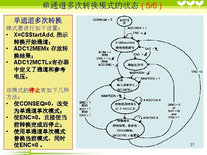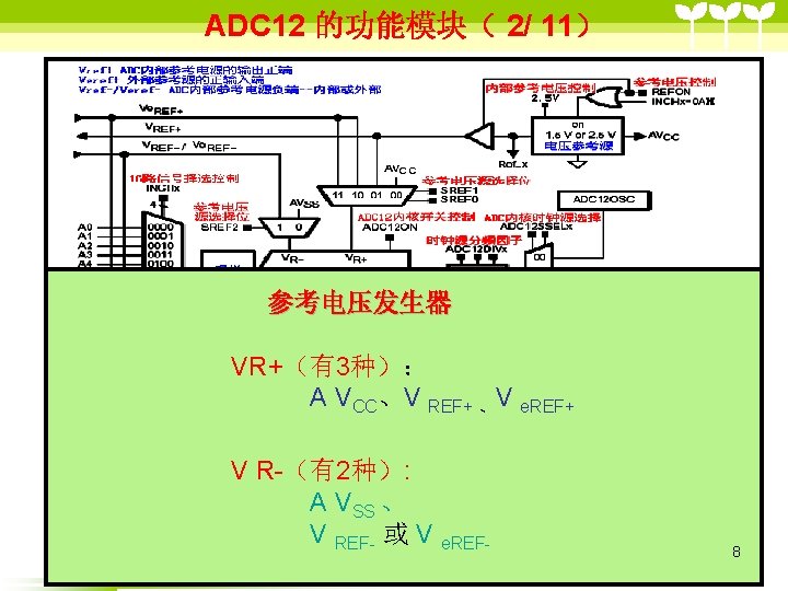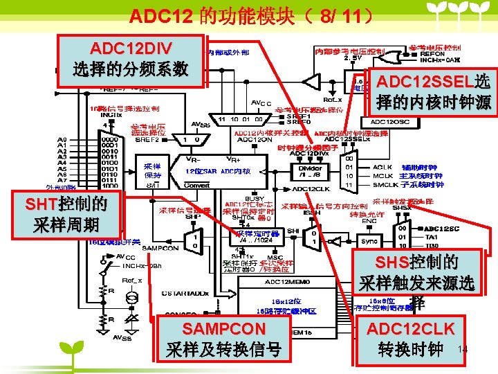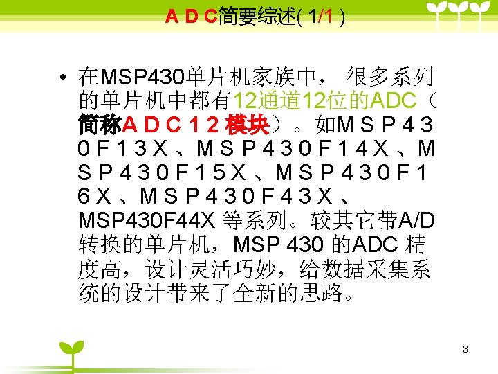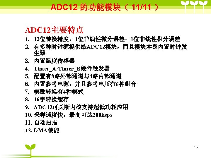 ADC 12 2 ADC 12 6 36 includemsp Slides: 41 Download presentation ADC 12的目录 2 ADC 12 的结构 6 单通道单次转换模式状态( 3/6 ) #include”msp 430 x 44 x. h” Void main (void) { WDTCTL=WDTPW+WDTHOLD; P 6 SEL |=0 x 01; //使能AD通道A 0 ADC 12 CTL 0=ADC 12 ON+SHT 0_2; ADC 12 CTL 1=SHP; ADC 12 CTL 0 |= ENC; While(1) { ADC 12 CTL 0 |=ADC 12 SC; while((ADC 12 IFG&BIT 0)==0) _NOP( ); } } 35 ADC 12应用举例 (一、使用内部参考源) ( 1/ 3) #include "msp 430 x 44 x. h" void main(void) { unsigned int i; WDTCTL = WDTPW+WDTHOLD; P 6 SEL |= 0 x 01; // 使能 A/D 通道A 0 ADC 12 CTL 0 = ADC 12 ON+SHT 0_2+REFON+REF 2_5 V; ADC 12 CTL 1 = SHP; ADC 12 MCTL 0 = SREF_1; // V r+ =V ref+ for ( i=0; i<0 x 3600; i++) ; // 为参考源启动提供延迟 ADC 12 CTL 0 |= ENC; // 使能转换 while (1) { ADC 12 CTL 0 |= ADC 12 SC; // 开始转换 while ((ADC 12 IFG & BIT 0)==0); _NOP(); } } 39 ADC 12应用举例 (使用外部参考源 ) ( 2/ 3) #include "msp 430 x 44 x. h" void main(void) { WDTCTL = WDTPW+WDTHOLD; P 6 SEL |= 0 x 01; // 使能A/D 通道 A 0 ADC 12 CTL 0 = ADC 12 ON+SHT 0_2; //打开 ADC 12, 设置采样时钟 ADC 12 CTL 1 = SHP; // 使用采样时钟 ADC 12 MCTL 0 = SREF_2; // Vr+ = Ve. REF+ (外部) ADC 12 CTL 0 |= ENC; // 使能转换 while (1) { ADC 12 CTL 0 |= ADC 12 SC; // 开始转换 while ((ADC 12 IFG & ADC 12 BUSY)==0); _NOP(); } } 40